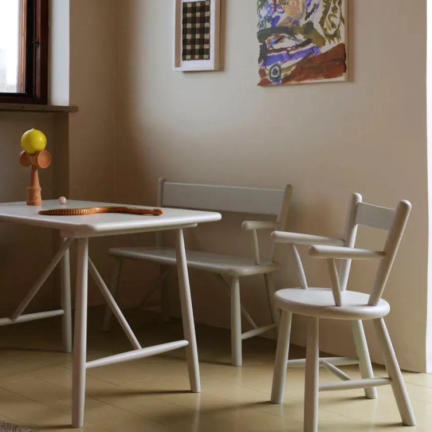 P10 er børnebordet der gør hverdagens leg og fordybelse smuk og enkel. Den rektangulære plade med blødt afrundede hjørner og de let skrånende ben giver et roligt udtryk og en stabil base til puslespil tuscher og små måltider. Bordet er en trofast videreførelse af Mogensens funktionelle formsprog fra 1946 og passer naturligt sammen med P9 børnestolen og P11 bænken. Vælg natur for et varmt klassisk look eller en af de fine farver der bringer leg og personlighed ind i rummet. Bordet er FSC certificeret og svanemærket så du får god samvittighed sammen med det tidløse design.