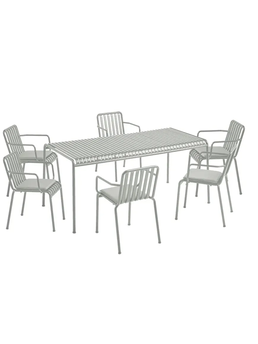 HAY Palissade Collection Den efterånden velkendte og holdbare Palissade kollektion fra HAY er både funktionel og smuk at se på. Her i et sæt med 6 armstole og et spisebord i farven “Sky Grey”. Sættet er inklusive 6 sædehynder.