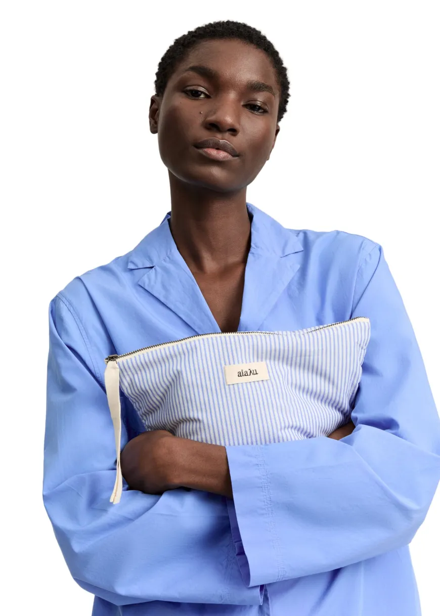 Den klassiske Pouch Petite fra Aiayu er den lille organiseringshelt, der skaber ro i tasken og på badeværelseshylden. Syet i blød, ansvarligt fremstillet økologisk bomuld med diskrete striber og en slidstærk, foret inderside, der tåler hverdagsbrug. Lynlåsen åbner bredt, så du hurtigt får overblik over makeup, små toiletsager eller tech-essentials – perfekt til både rejsen og hverdagens rutiner. Den rene, tidløse form og det lille Aiayu-logo giver et underspillet, nordisk udtryk, som holder sæson efter sæson. Pouch Petite er en favorit, fordi den kombinerer funktion, holdbarhed og æstetik i ét enkelt design – skabt i certificeret økologisk bomuld for en løsning, du kan bruge igen og igen.