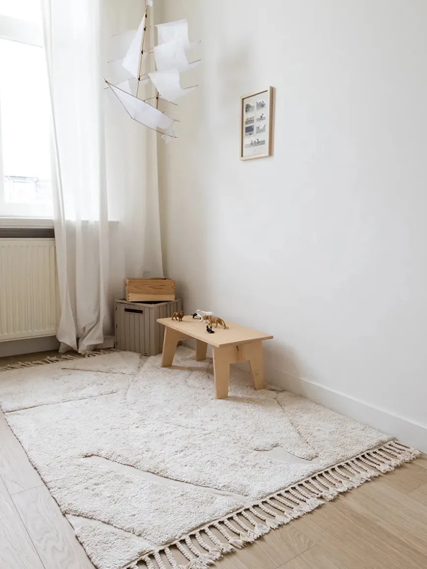 Smukt håndlavet gulvtæppe i blødt bomuld, som er perfekt til at skabe hygge og fuldende indretningen i både børneværelset, soveværelset eller stuen. Tæppet kan vaskes i maskinen på 30 grader hvilket er yderst praktisk, hvis man har allergi, børn eller bare skulle komme til at spilde på tæppet. Med anti-slip på undersiden, undgår du at glide rundt på det, dog anbefales at have et skridsikkert underlag. Små fnug kan forekomme i starten, hvilket er fibre fra selve processen tæppet vil gradvist fælder mindre og mindre og til sidst stopper.