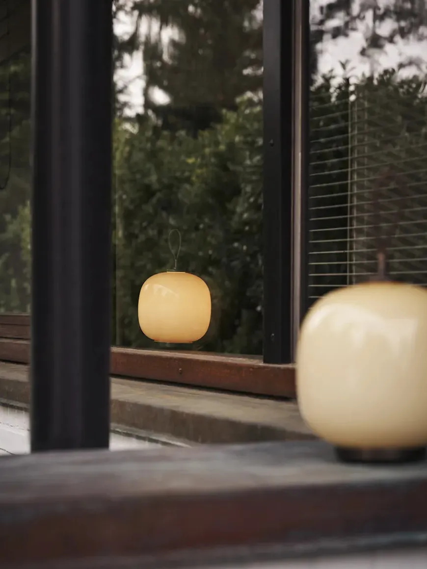 VL45 Radiohus portable Lamp fås i opal white, pale yellow og pale rose. Lampen kan dæmpes med touch på toppen.