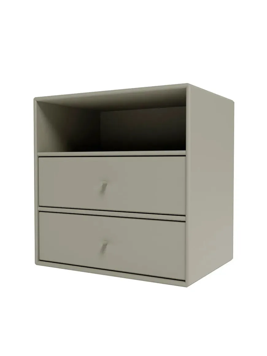 Montana Mini er en serie med mindre opbevaringsmoduler, som laves i 10 forskellige farver. Her finder du modulet med ét rum og to skuffer under, som giver gode muligheder for opbevaring af diverse ting, eksempelvis i soveværelset, entréen eller stuen. Serien laves af 8 millimeter MDF modsat de 12 millimeter, som resten af Montanas reoler. Ophæng medfølger.