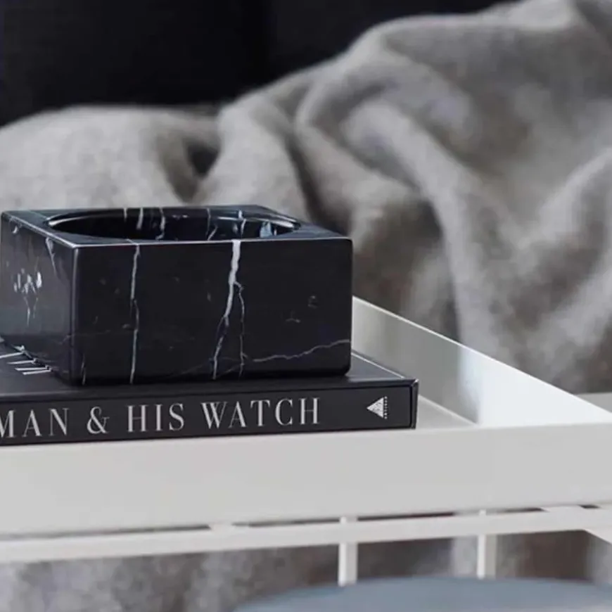 PK Marmor er lavet af Nero Marquina Marble. Indersiden er en blød afrundet kurve, og den skinnende overflade reflekterer lys, der rammer den. Udvendig er skålen kantet og ru og viser det upolerede materiale