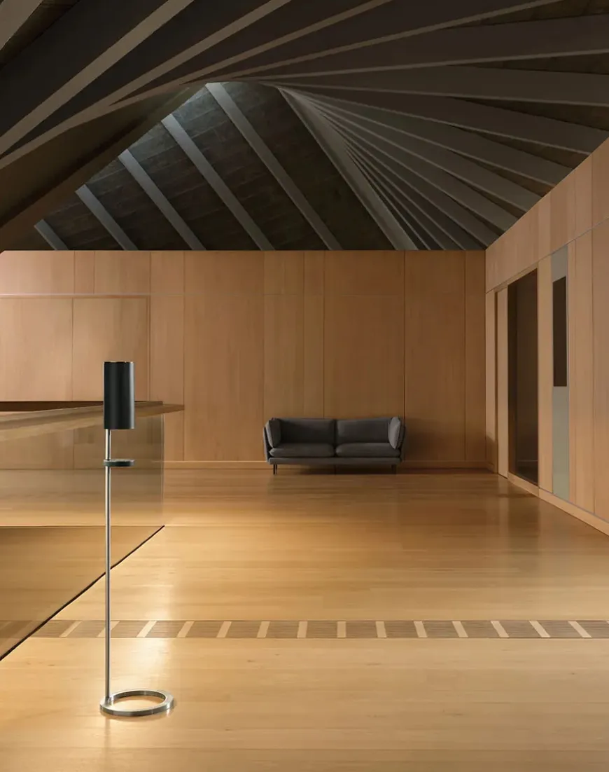 Sensorstyret håndsprit- og sæbedispenser fra VOLA i en fritstående version. Den æstetisk smukke dispenser har en slankt og enkelt design og har samtidig den praktiske funktion, at den er berøringsfri. Der medfølger separate pumpemoduler, så den kan bruges til sæbe, skum eller desinfektionsspray.